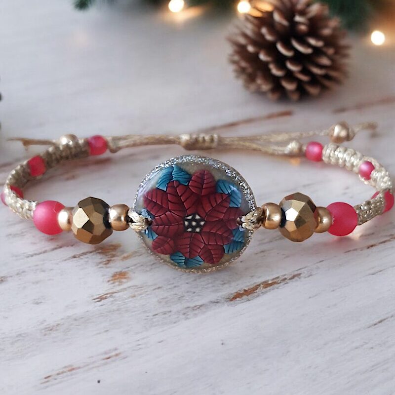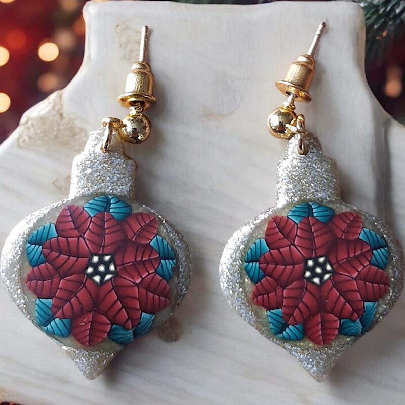 Pour briller de mille feux pendant les fêtes, j’ai créé cette jolie collection de bijoux festifs avec mon motif de poinsettia, aussi appelé fleur de Noël, Le motif est incrusté sur un fond à paillettes doré, argenté et blanc nacré. Mes bijoux sont très légers et iront avec toutes vos tenues vestimentaires.